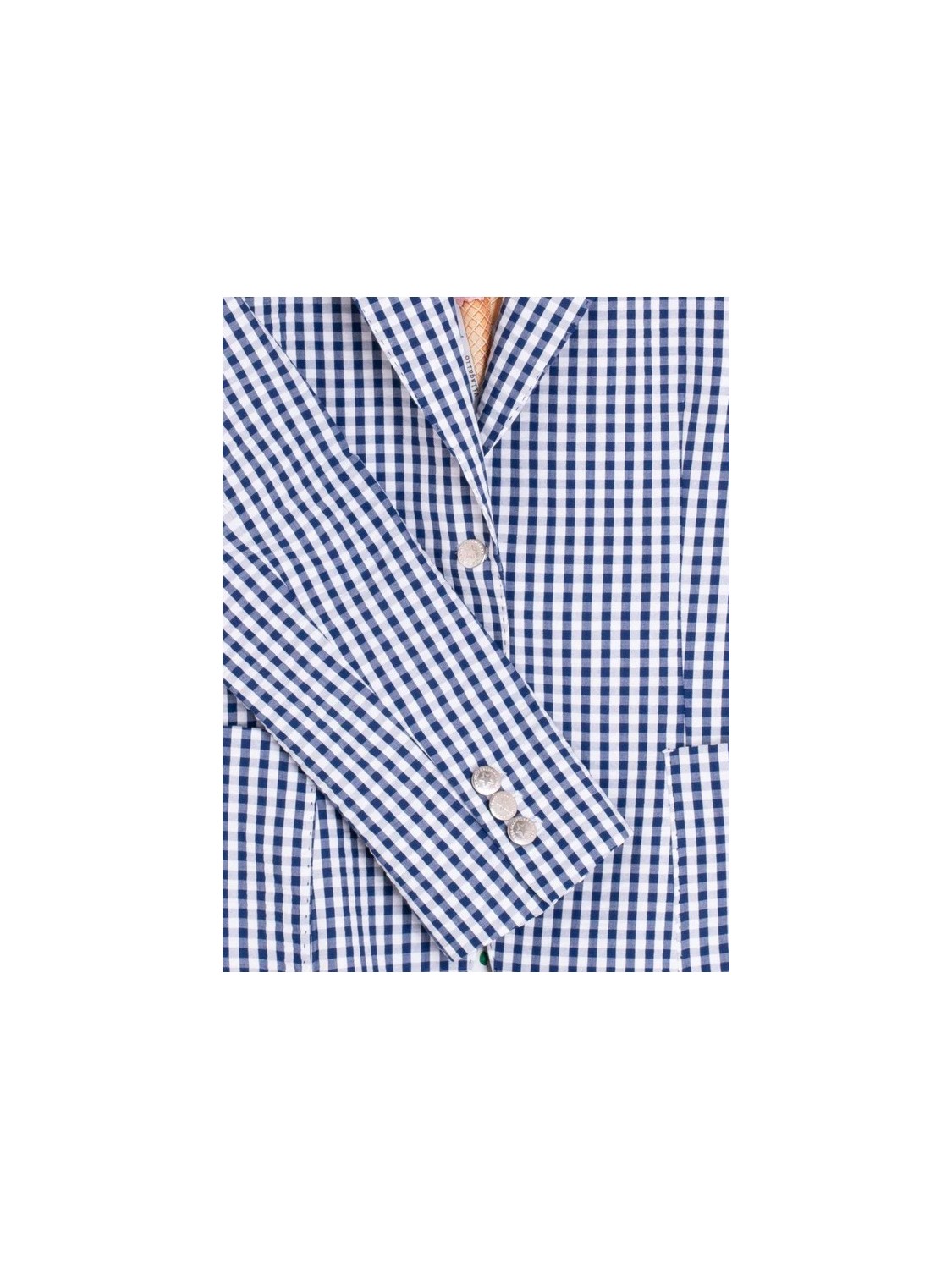 Chaqueta de cuadros vichy en azul y blanco con solapa clásica y cierre frontal de un botón. Presenta dos bolsillos de parche delanteros.