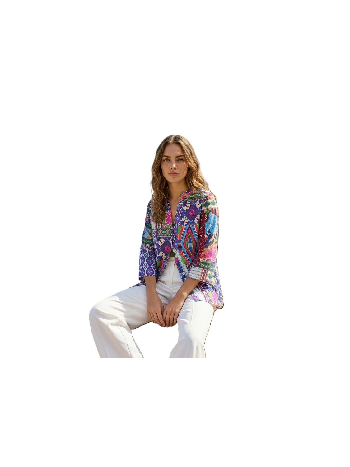 Camisa con diseño patchwork de estampados geométricos y florales en tonos vibrantes como azul, rosa, verde y amarillo.