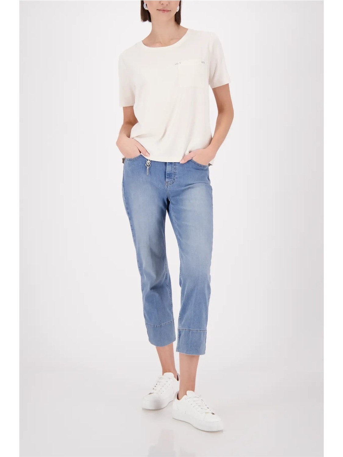 Camiseta viscosa fluida se combina con brillantes diamantes de imitación y un bolsillo en el pecho agrega brillo a cualquier atuendo.