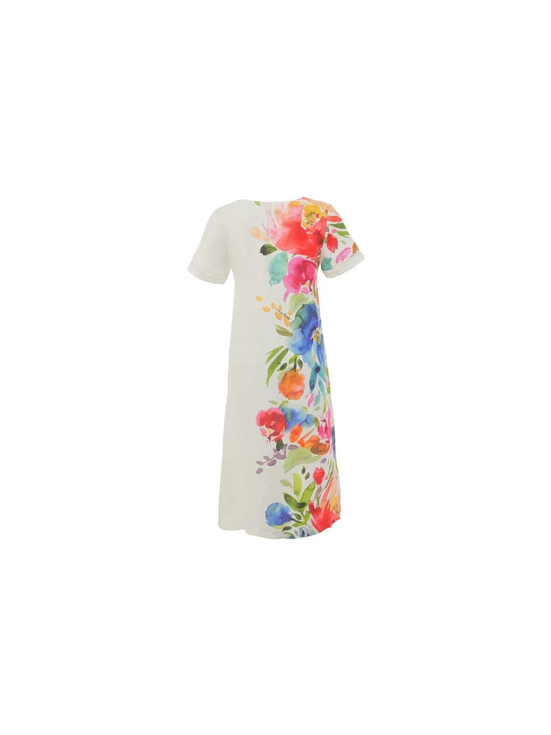 Vestido de lino de corte midi con cuello pico de manga corta y ñala mitad con estampado de flores.