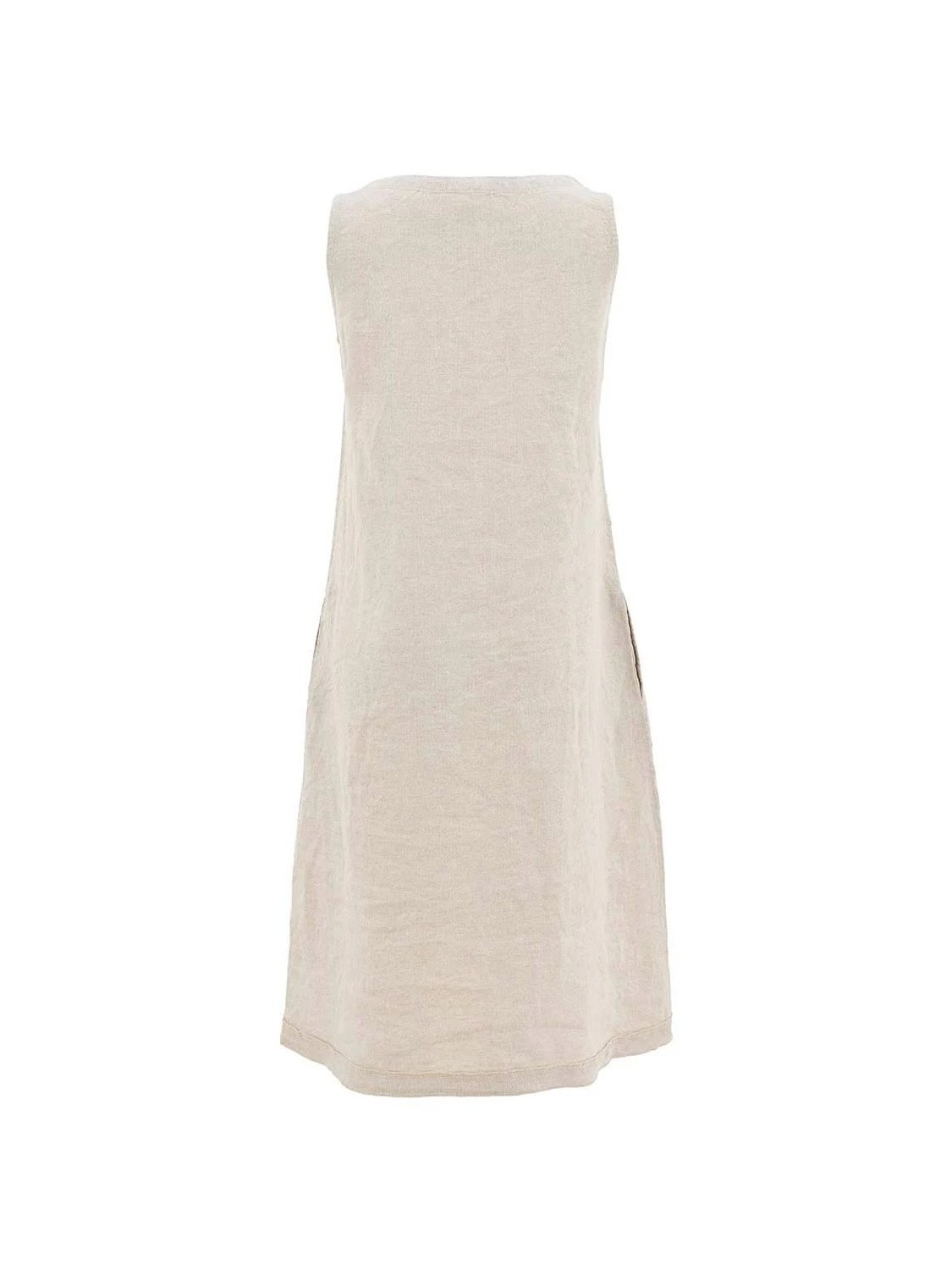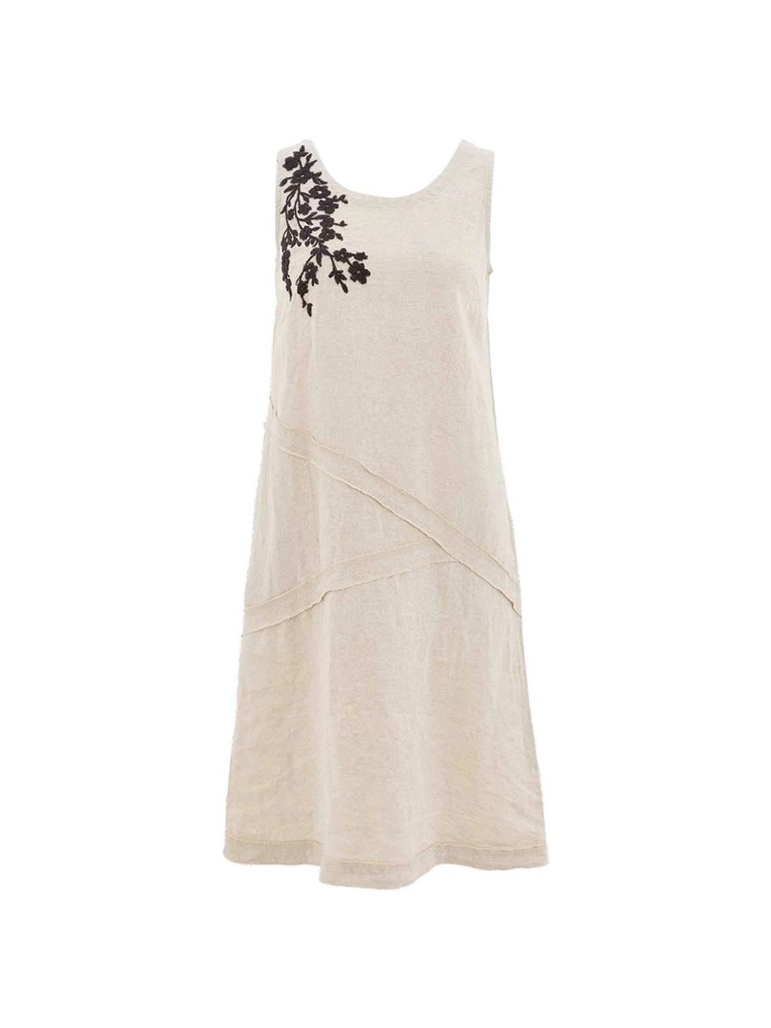 Vestido de lino con cuello redondo y manga sisa. Bordade de flores negras en el lado derecho que le dan un toque primaveral.